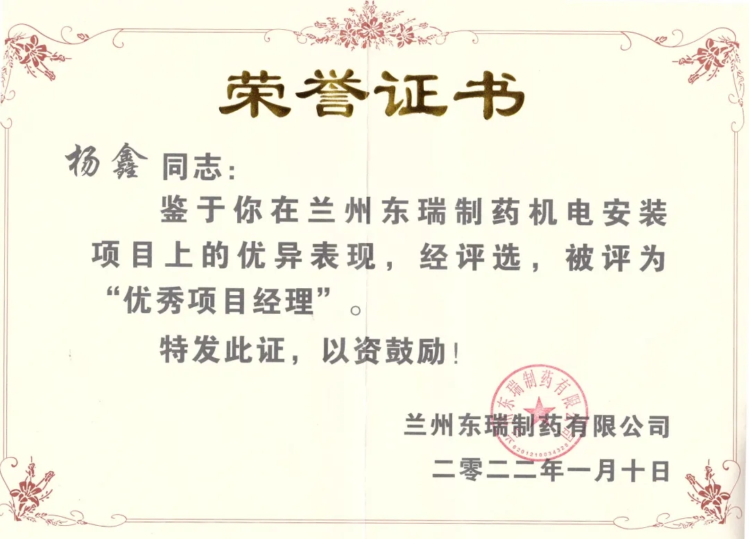 Yang Xin, the project manager of Lanzhou Dongrui won the commendation from the owner